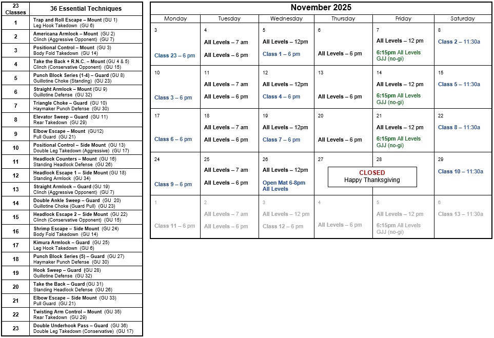 We have divided the 36 Gracie Combatives® techniques into 23 one-hour classes so that you can complete the course at your own pace. We designed each lesson so that you can start at any point in the course. As a result, you can complete the 23 lessons in any order. Upon enrolling, we will issue you a Gracie Combatives® attendance card on which we will track your progress every step of the way.