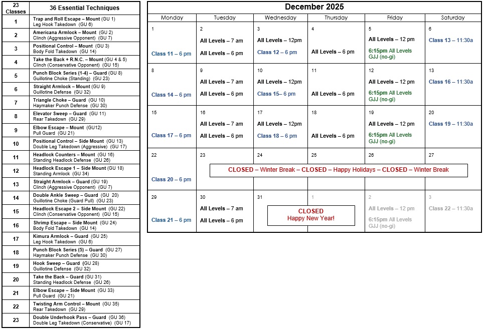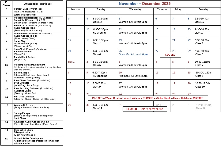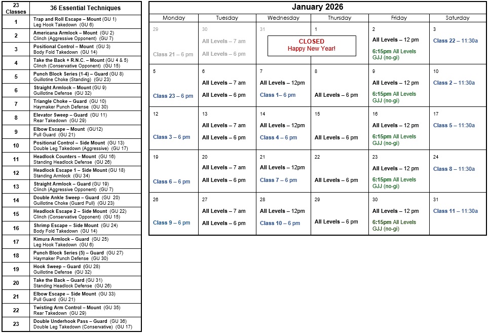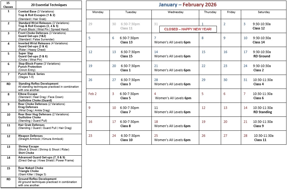 Please use these calendars to help you keep track of what lessons you have already attended, and which classes you are missing and need to attend. The class number and technique guide follows the calendars at the bottom of the page. A hard-copy of these calendars are also available at the dojo.